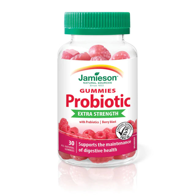 Jamieson Extra Strength Probiotic Gummies with Prebiotics are a delicious way to support your digestive health. These raspberry flavoured gummies provide 5 billion active cells and include chicory root fibre, a source of prebiotic fibre that actively nourishes the probiotics.