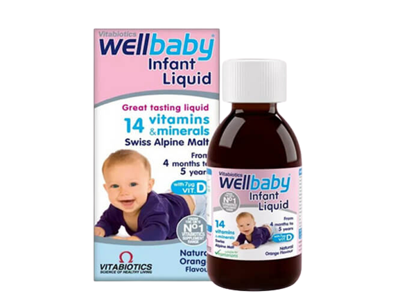 Wellbaby Multi-vitamin Liquid provides an ideal nutritional safeguard during a time when babies and infants have a high nutrient requirement in relation to body size, to support their rapid physical growth and development of bones, muscles, blood and the brain. Key nutrients include iron, which contributes to normal cognitive development, and 10 µg vitamin D, which is needed for normal growth and development of bone in children. Vitamin D also contributes to their normal immune system function.